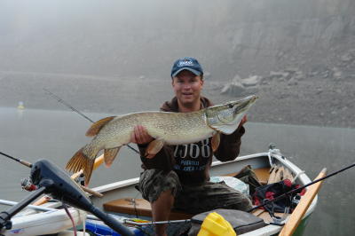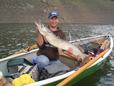 Am späten Vormittag kann ich einen End 70er landen, der einen guten Drill liefert und den Gummifisch voll genommen hat. Doch vor allem der bisweilen stürmische Wind macht mir mit meinem Boot doch sehr zu schaffen. Gegen zwei Uhr beschließe ich dann schließlich den Heimweg anzutreten, bin also schon halb am Einpacken und höre mit einem Mall nur das ersehnte "BSSSSSSSSSSSSSSSSSSSSSSSSSSSSSSSSSSSSSS" der Bremse! Durch den starken Wind, das schnell treibende Boot und den in die entgegengesetzte Richtung flüchtenden Fisch ist der Drill eine Herausforderung. Schnell reißt der Hecht etliche Meter Schnur von der Rolle, lässt sich in der Folge dann aber wie ein nasser Sack in Richtung Boot dirigieren, um erst kurz vor dem Boot nochmal durchzustarten...